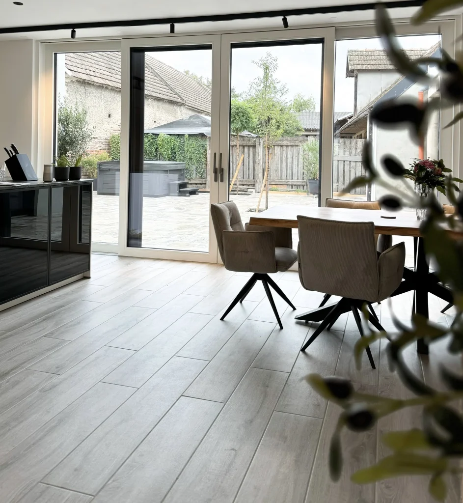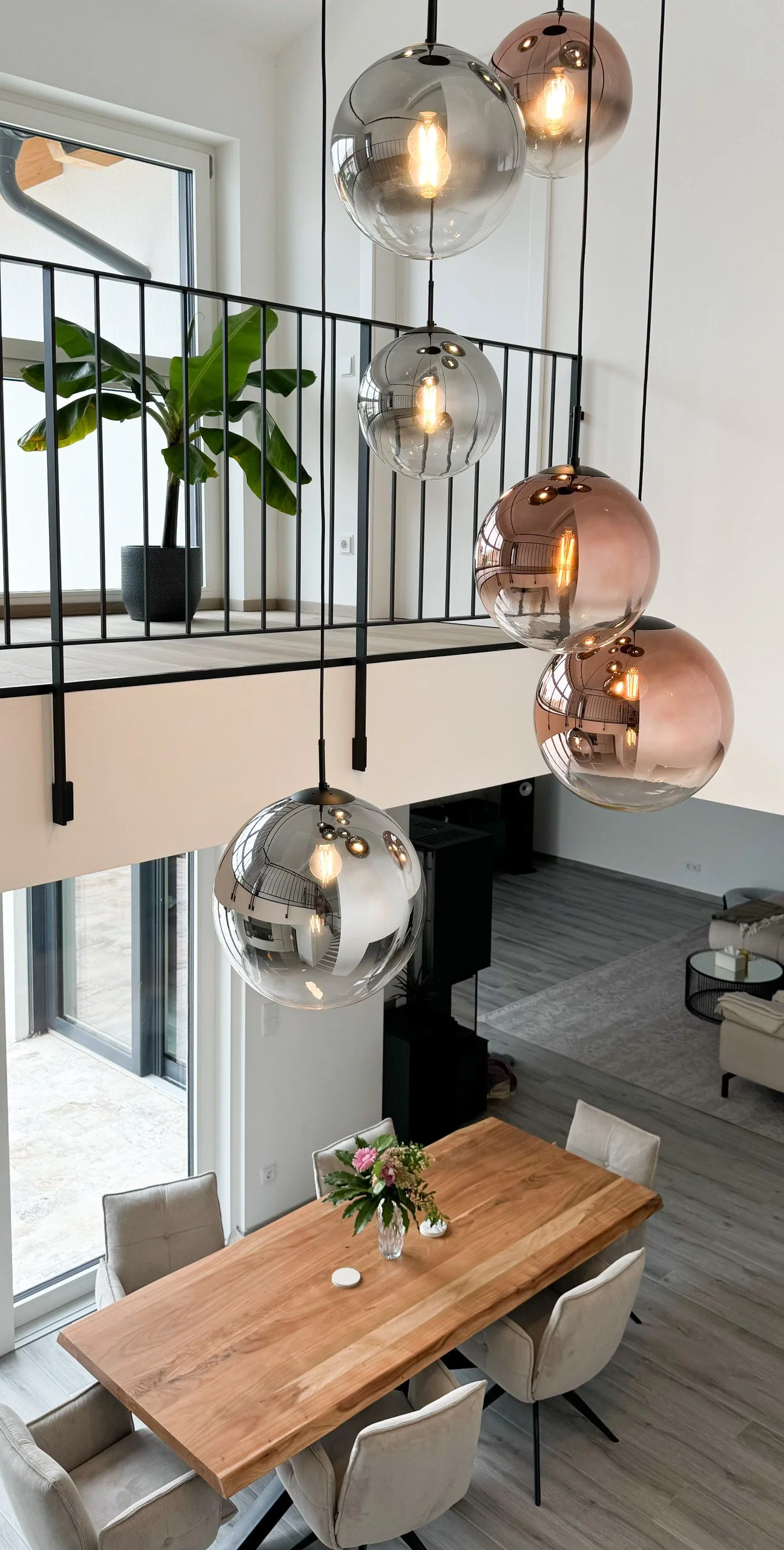 Dieses wunderschöne Haus wurde 2023-2024 neu gebaut und ich hatte das Vergnügen, es komplett einzurichten – in Niederösterreich, nordöstlich von Wien. Der Esszimmerbereich, verbindet modernes Design mit natürlichen Akzenten. Der zentrale Holztisch mit seiner massiven, naturbelassenen Oberfläche verleiht dem Raum Wärme und Natürlichkeit. Die Kombination mit den schwarzen Metallbeinen verleiht dem Raum den typischen Industrial Chic, während die hellen, stoffbezogenen Stühle für Komfort und Gemütlichkeit sorgen.