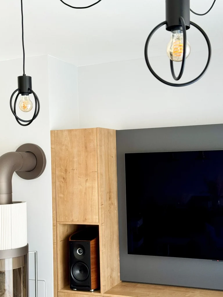 Im Wohnzimmer steht ein moderner, minimalistisch gestalteter Kaminofen im Mittelpunkt, umgeben von warmen Holzelementen, die sich in den maßgefertigten Möbeln und dem Fußboden widerspiegeln. Die schwebende TV-Wand verbindet Funktionalität und Stil, während die offenen Glühbirnen in den Pendelleuchten für authentisches Industrieflair sorgen. Diese Lampen setzen mit ihrer rauen, aber eleganten Optik bewusst Akzente und tauchen den Raum in ein warmes Licht.