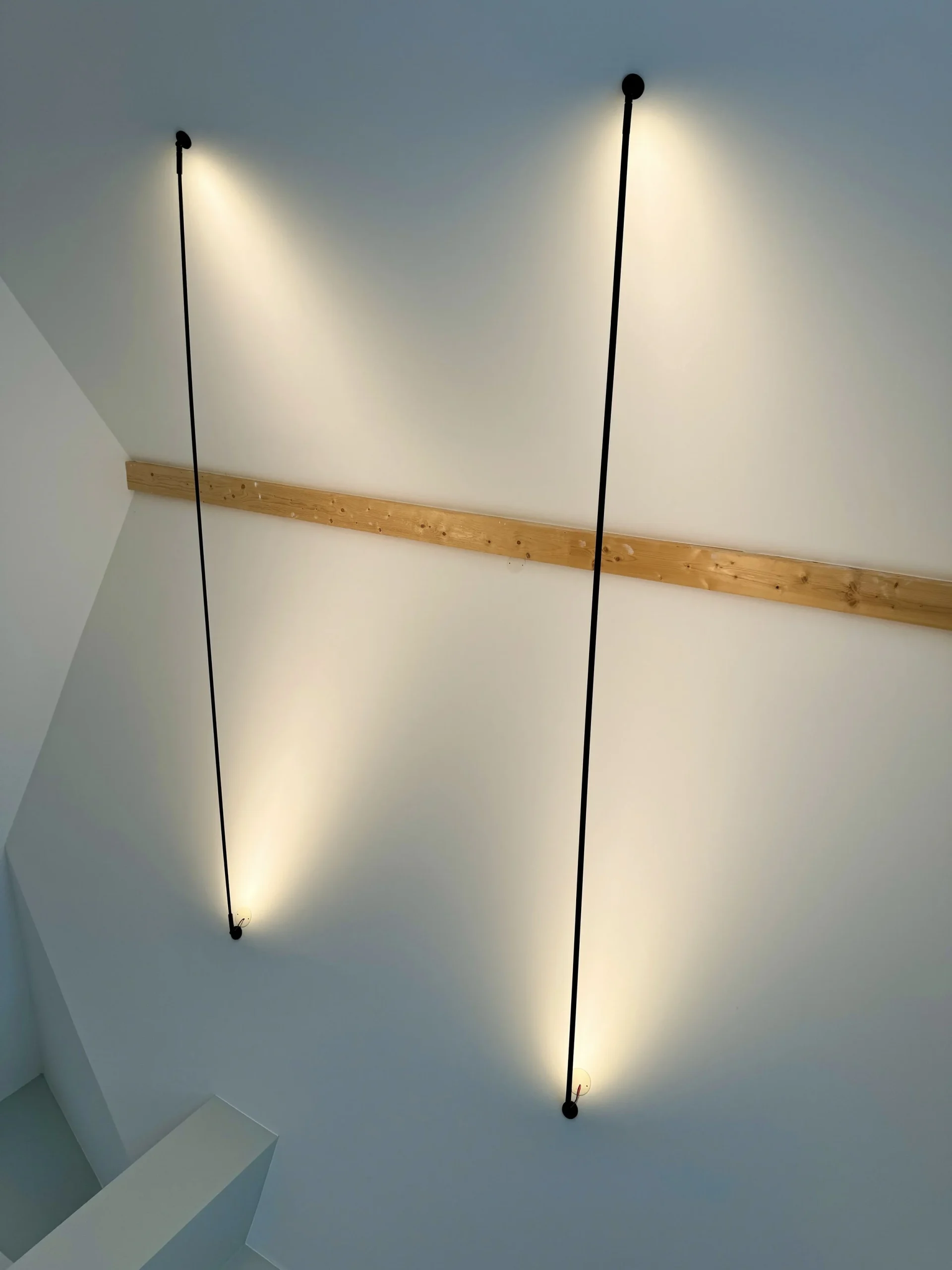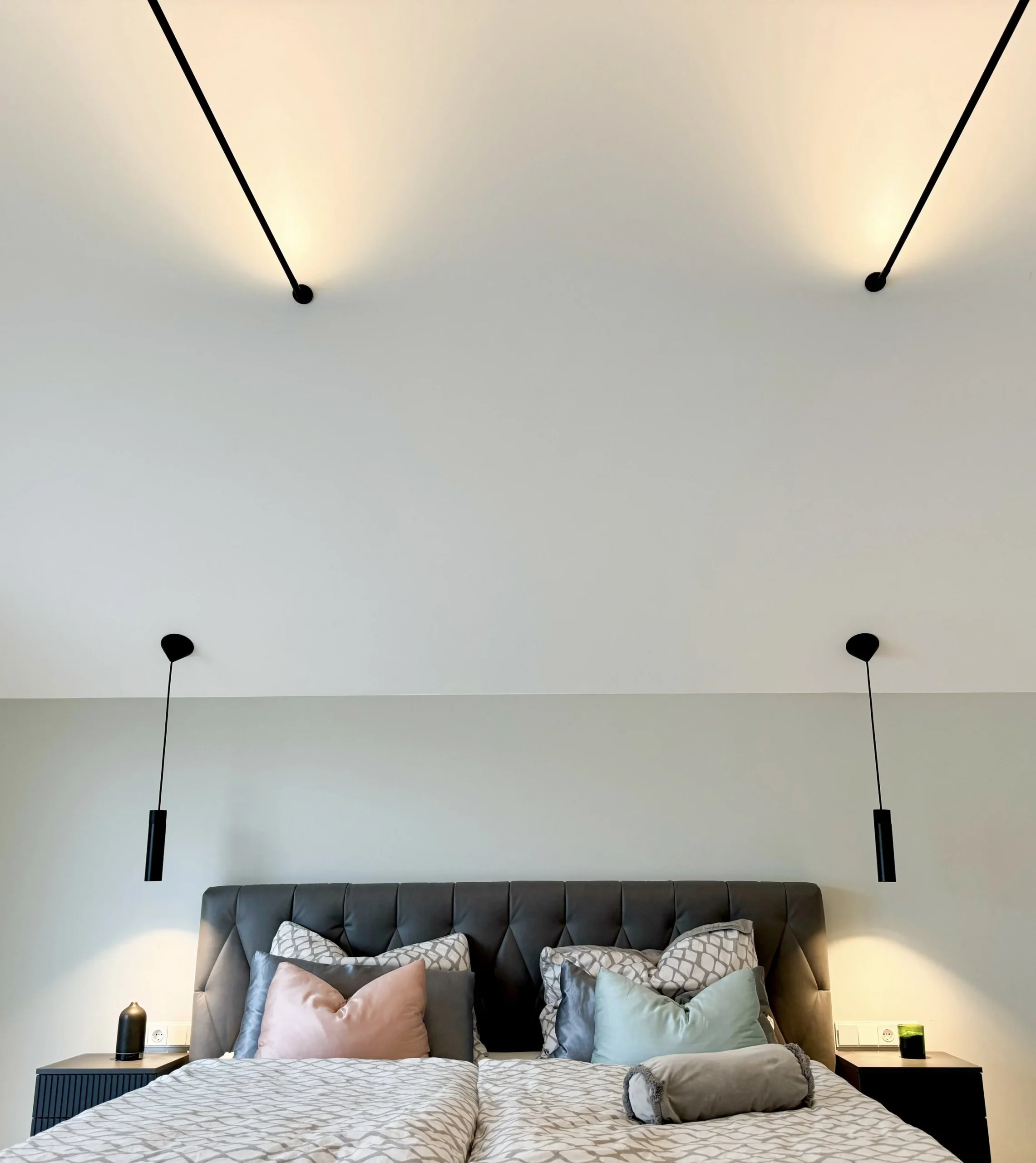 Im Schlafzimmer sorgt die indirekte Beleuchtung mit filigranen Seilen an der Decke für eine besonders wohnliche Atmosphäre. Dieses sanfte Lichtkonzept schafft eine behagliche Atmosphäre, die den Raum harmonisch wirken lässt. In den großen, offenen Bereichen spielt die Lichtplanung eine zentrale Rolle, um eine ruhige und entspannte Atmosphäre zu schaffen, die gleichzeitig modern und einladend wirkt.