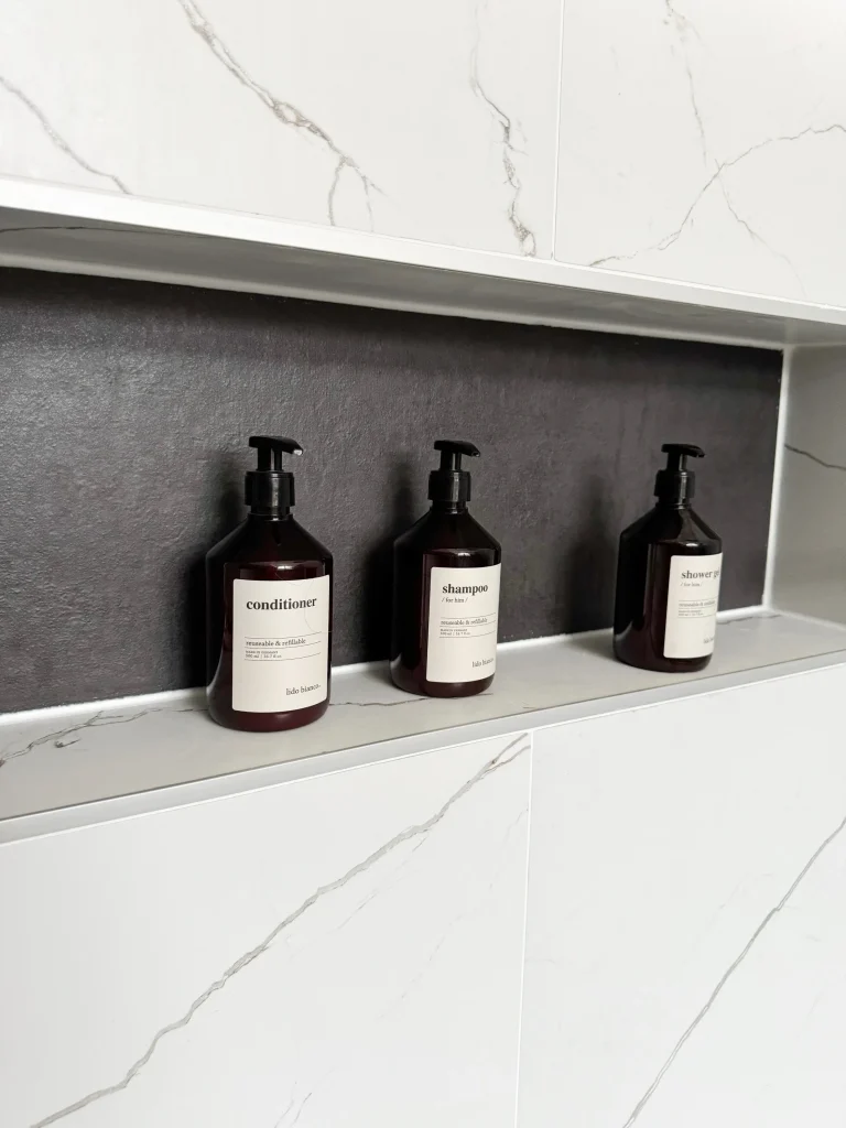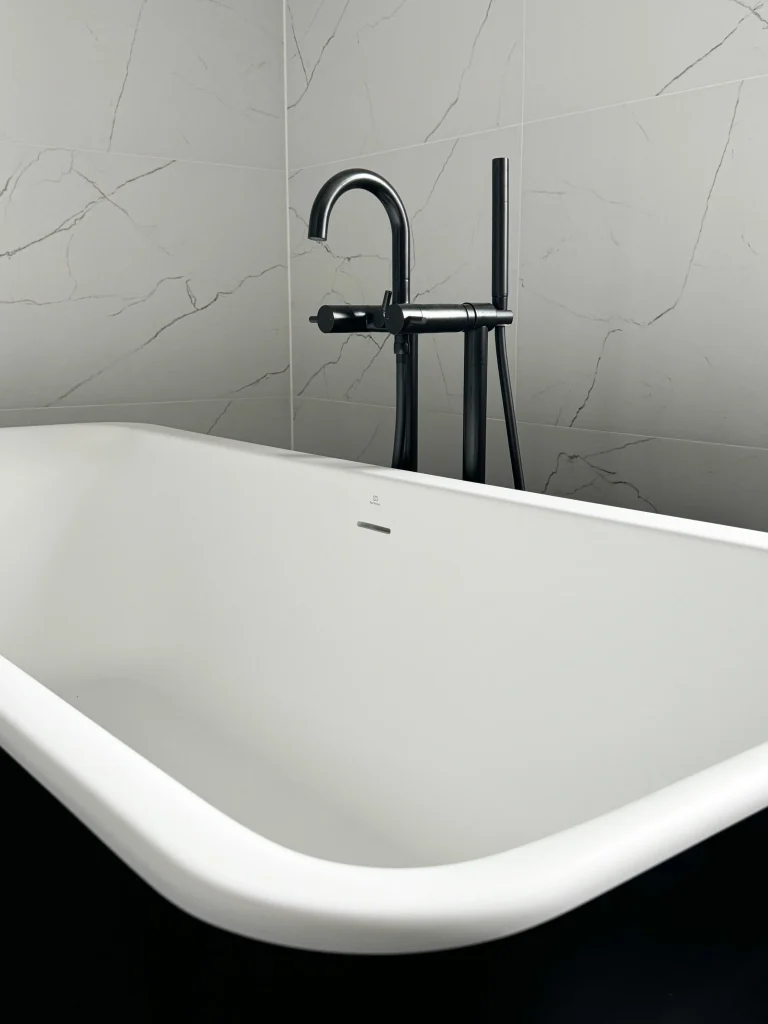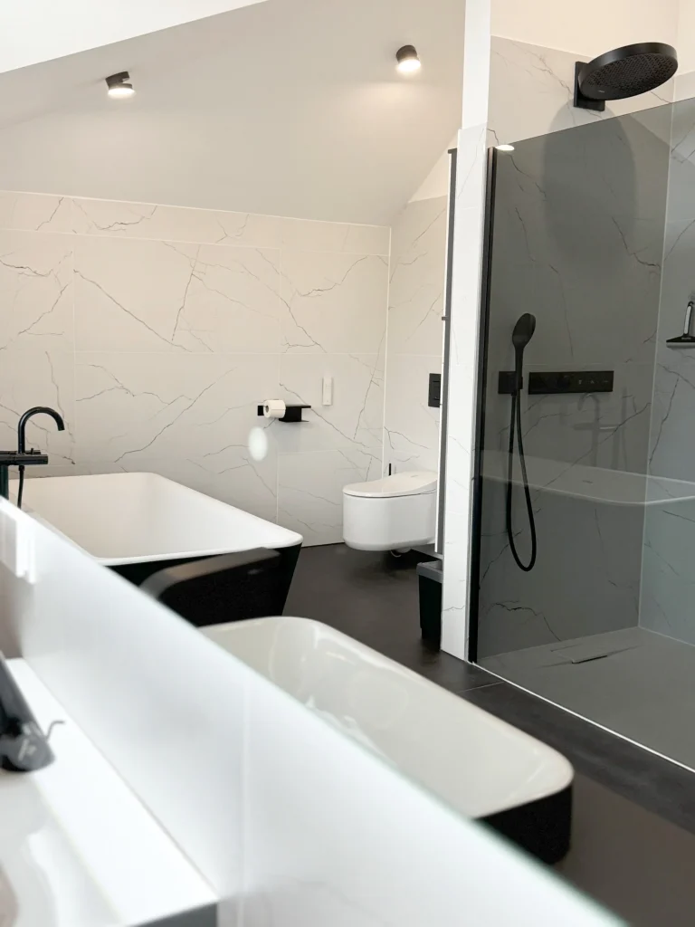 Die hochwertigen Marmorwände schaffen eine luxuriöse Atmosphäre, während der Kontrast von Schwarz und Weiß das Design klar und stilvoll erscheinen lässt. Die Kombination aus glatten Oberflächen, edlen Materialien und eleganten Rundungen macht das Bad zu einem besonderen Highlight, das modern und funktional zugleich ist.