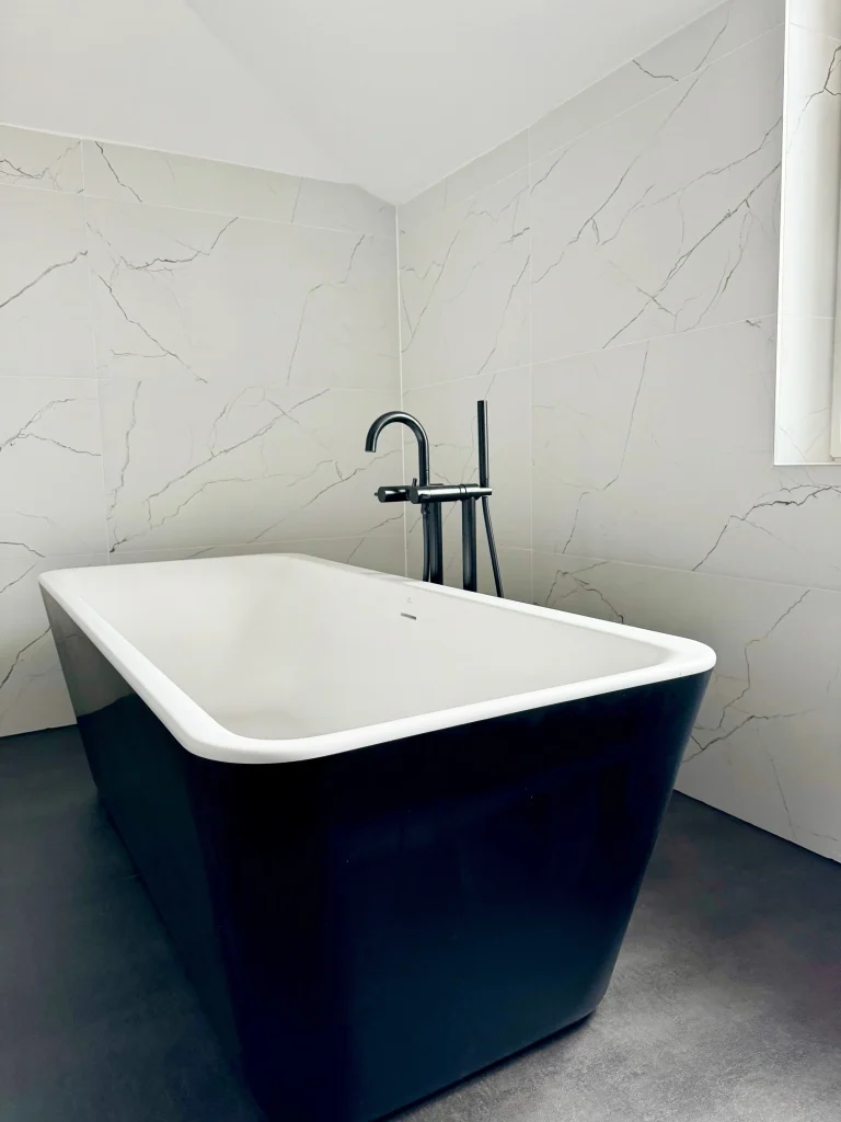 Dieses Master Badezimmer zeichnet sich durch elegante Marmorwände und ein minimalistisches Schwarz-Weiß-Design aus, das für einen modernen und zeitlosen Look sorgt. Im geräumigen Badezimmer kommt diese elegante Kombination besonders gut zur Geltung. Die abgerundeten Kanten von Badewanne und Waschtisch verleihen dem Raum eine besondere Weichheit und Harmonie, die das ansonsten klare und reduzierte Design perfekt ergänzt. Diese Details schaffen eine zeitlose Eleganz, die jenseits von Trends Bestand hat.