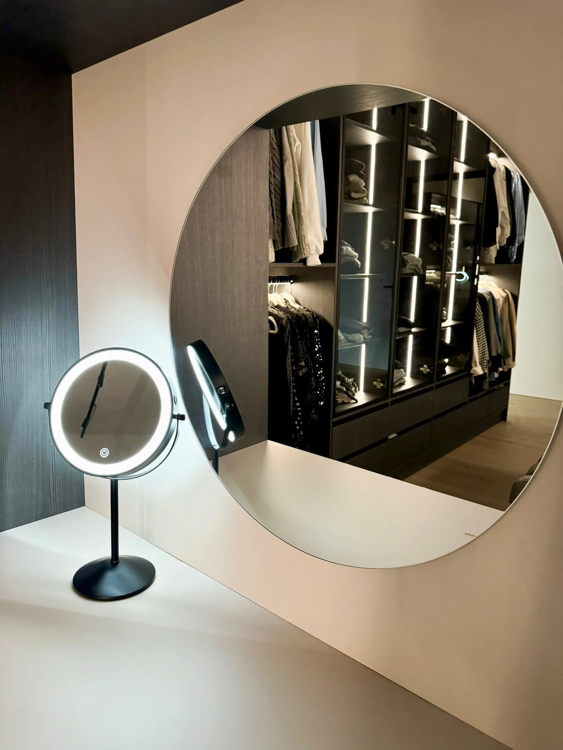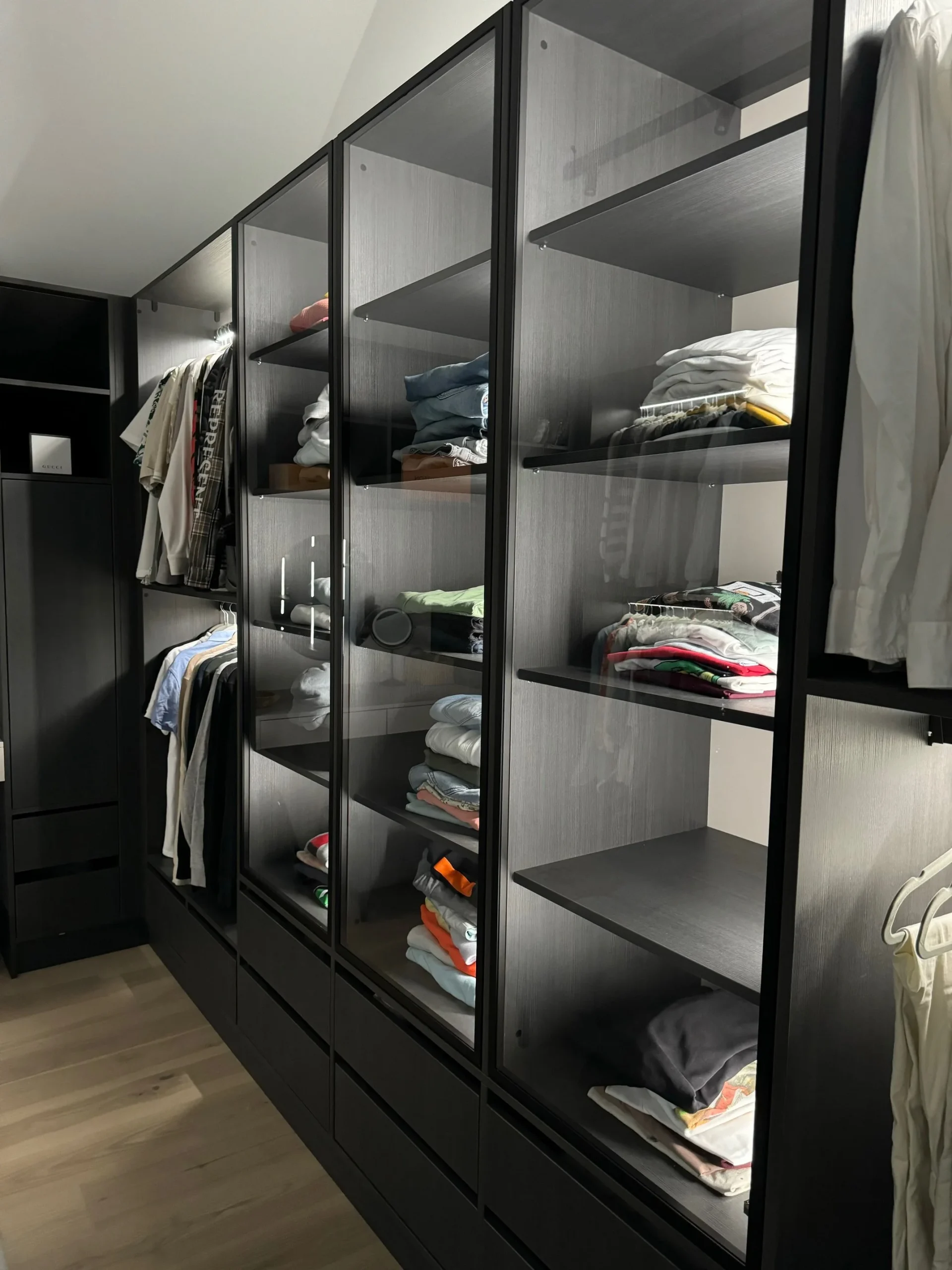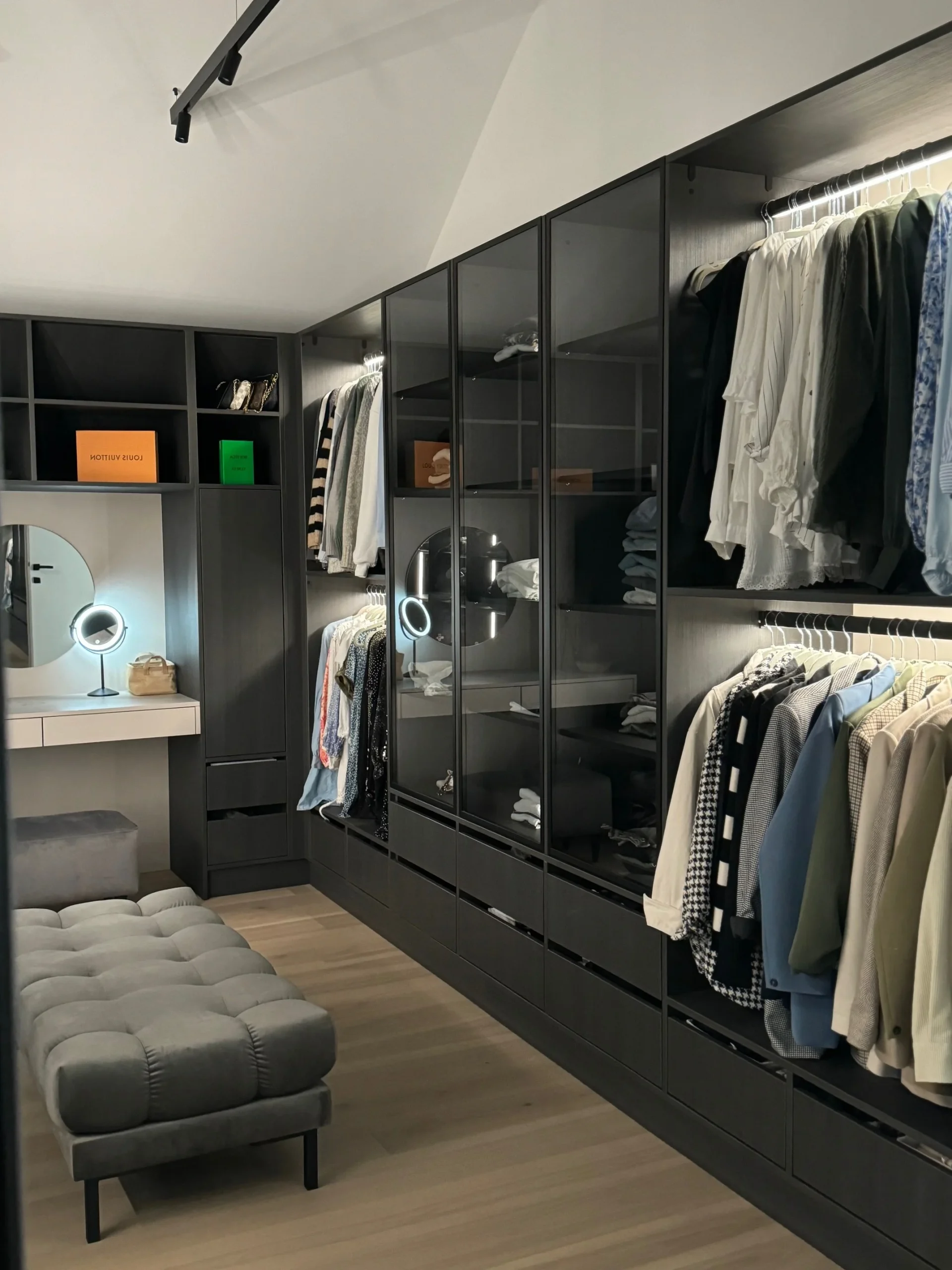 Besonders wichtig ist die integrierte Beleuchtung. Gerade in einem Kleiderschrank muss jedes Fach gut ausgeleuchtet sein, damit man immer den perfekten Überblick hat. Mit der sanften LED-Beleuchtung, die ich hinter den Glasfronten der Schränke angebracht habe, werden Lieblingsstücke ins rechte Licht gerückt und der Raum wirkt noch großzügiger und moderner.