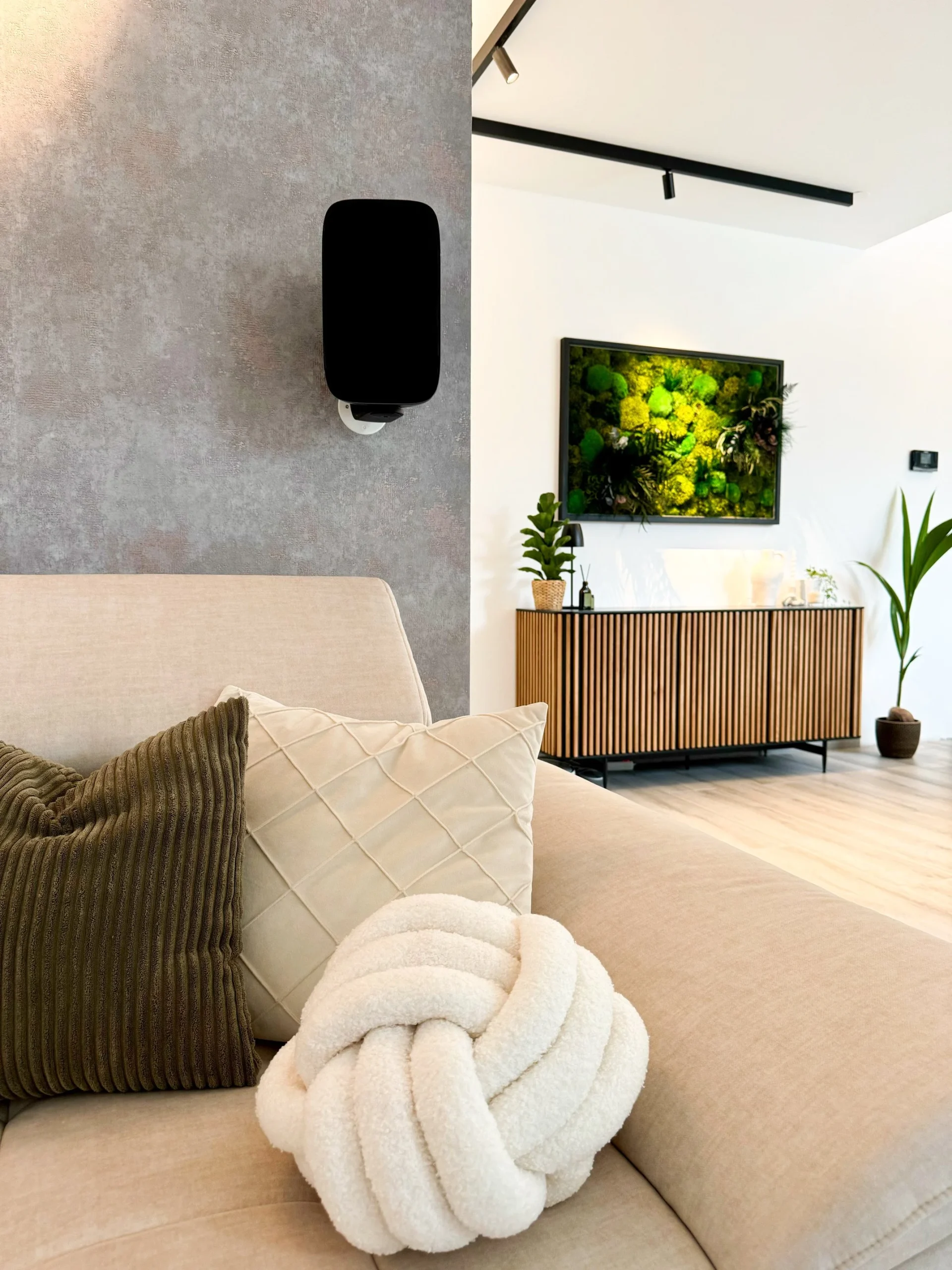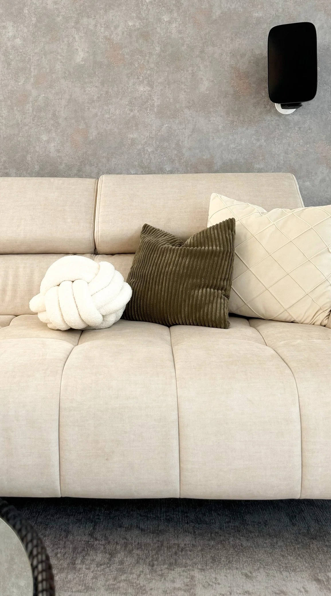 In diesem Projekt besticht die Kombination von modernen Designelementen und natürlichen Akzenten, die sich harmonisch durch den gesamten Wohnbereich ziehen. Die Wand ist mit einer exklusiven Tapete gestaltet, die durch ihre dezente Struktur und die erdigen Töne dem Raum Tiefe und Charakter verleiht. Im Mittelpunkt steht ein helles, modernes Sofa, dessen weiche Texturen und dezente Farben eine gemütliche und einladende Atmosphäre schaffen. Die ausgewählten Kissen mit unterschiedlichen Stoffmustern runden das minimalistische und doch wohnliche Ambiente ab.