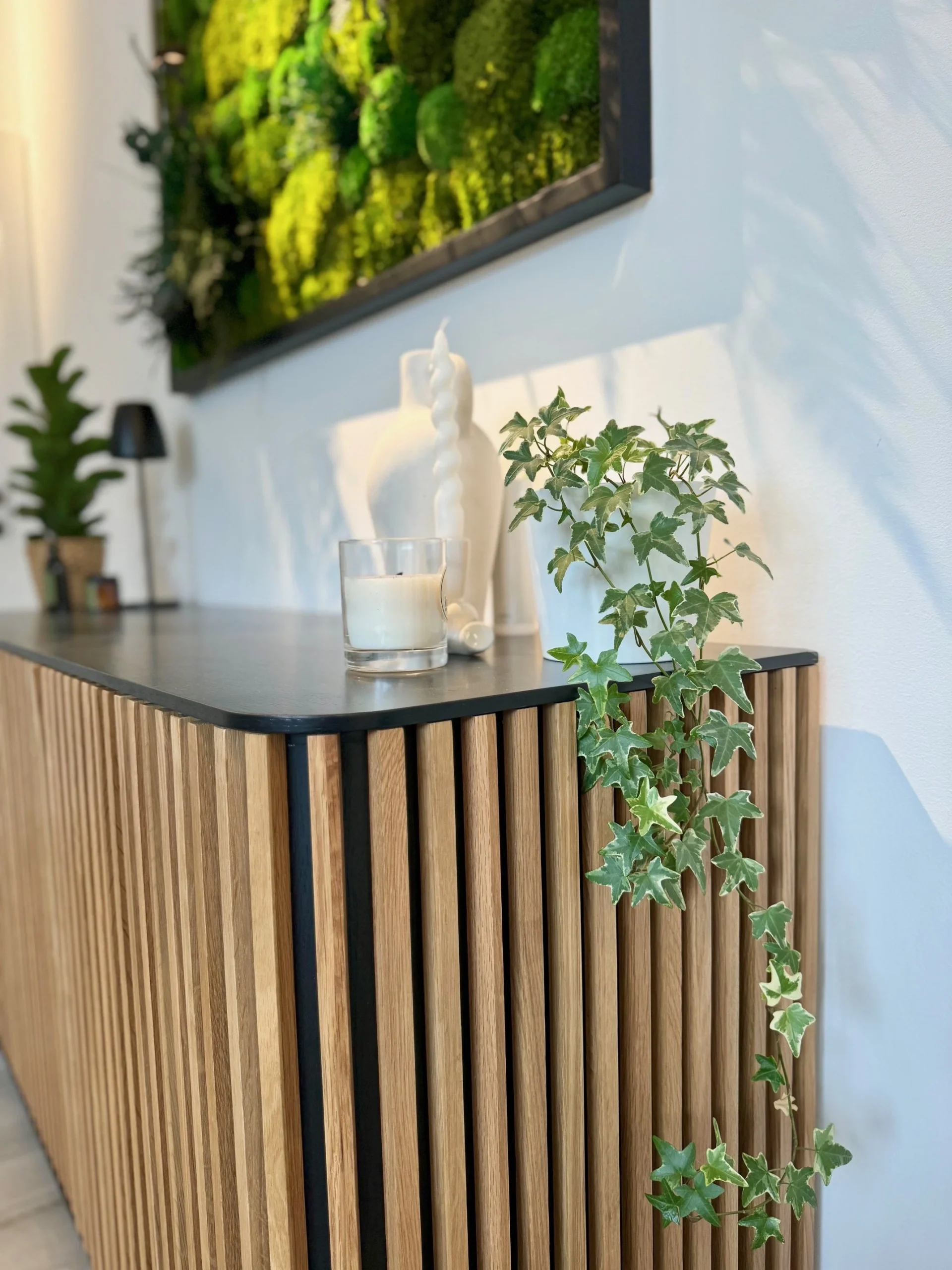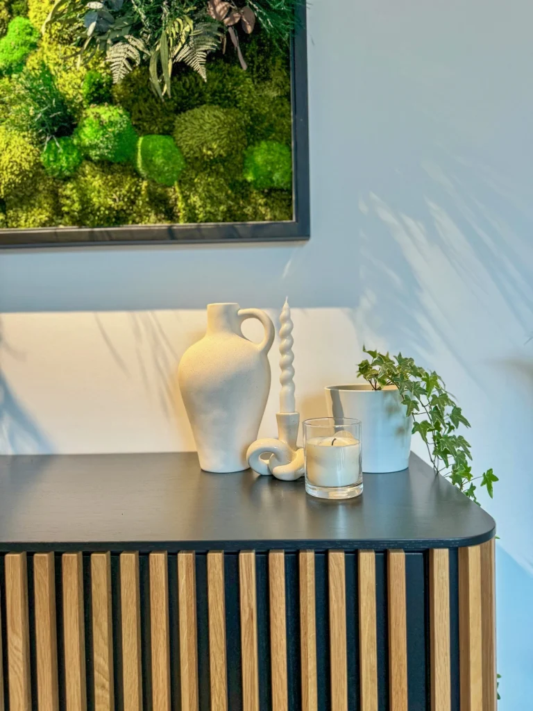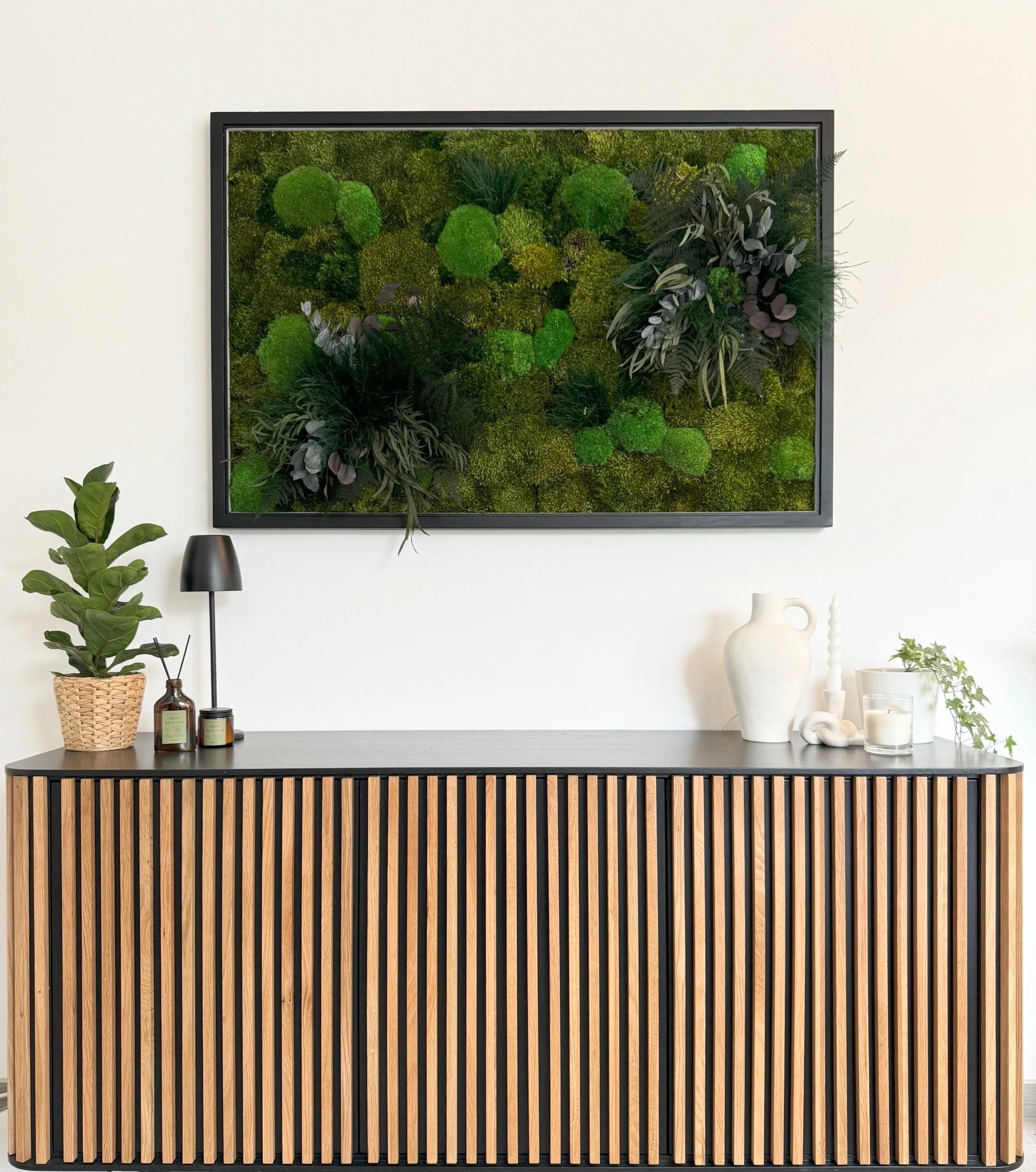 Besonders hervorzuheben ist die schöne Kommode, die mit einem auffälligen Moosbild verziert ist. Das Moosbild bringt nicht nur einen grünen, natürlichen Akzent in den Raum, sondern erfüllt auch eine funktionale Aufgabe. In großen, offenen Wohnbereichen wirkt es schallabsorbierend und verbessert die Akustik, wodurch eine ruhigere und angenehmere Atmosphäre entsteht. Diese Kombination von Design und Funktionalität zeigt, wie ästhetische Elemente gleichzeitig praktische Vorteile bieten können, insbesondere in offenen, weitläufigen Räumen.