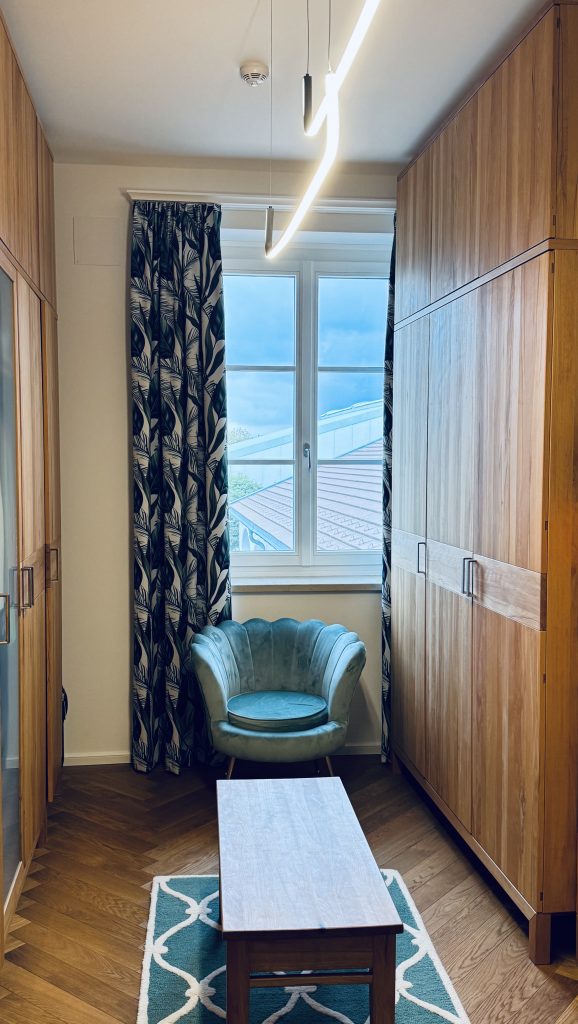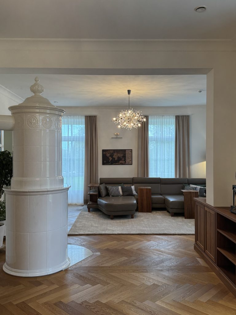 Die vorhandene Architektur mit ihren hohen Decken, den großzügigen Fenstern und traditionellen Elementen wie dem Kachelofen oder dem Kronleuchter durfte ihren Charakter behalten – wurde aber mit zeitgemäßen Materialien, Licht und Textilien neu interpretiert.