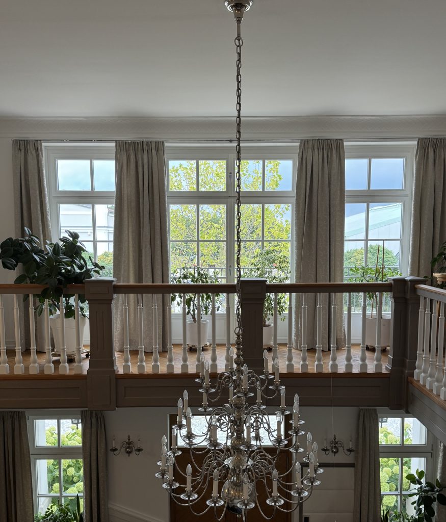 Besonders in hohen Räumen spielen Stoffe und Vorhänge eine entscheidende Rolle: Sie schaffen Akustik, Weichheit und Geborgenheit.